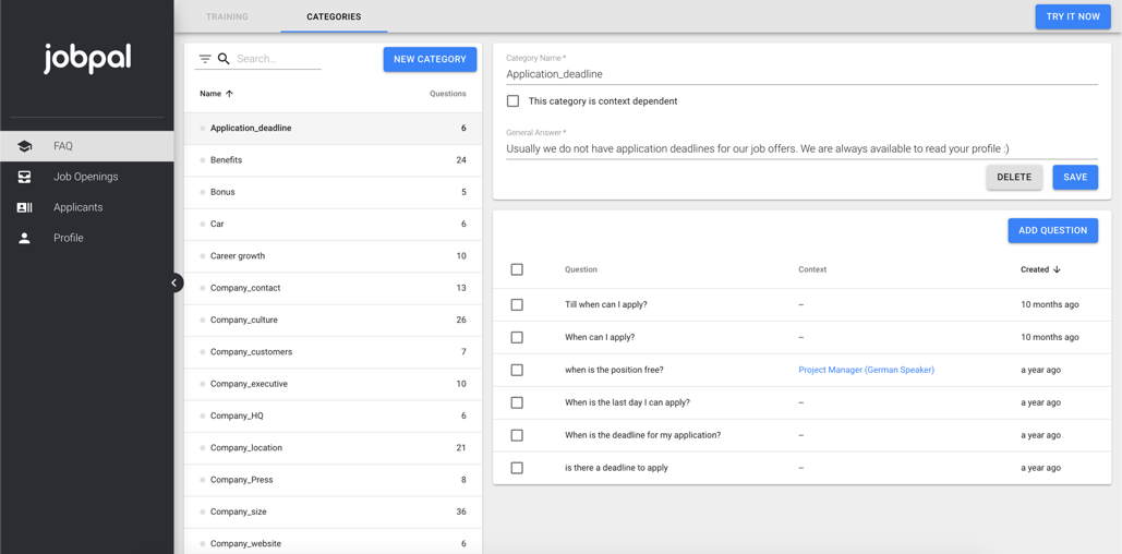 Our dashboard provides important stats to help you tune your integration. See how many questions the chatbot is able to handle and where it needs further training. See at-a-glance performance statistics for your chatbot and your open positions which help to focus your team's efforts in the right places.
