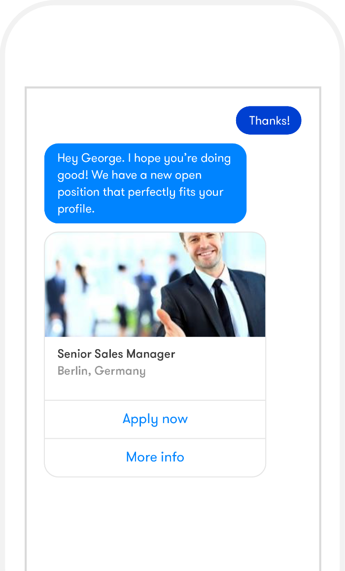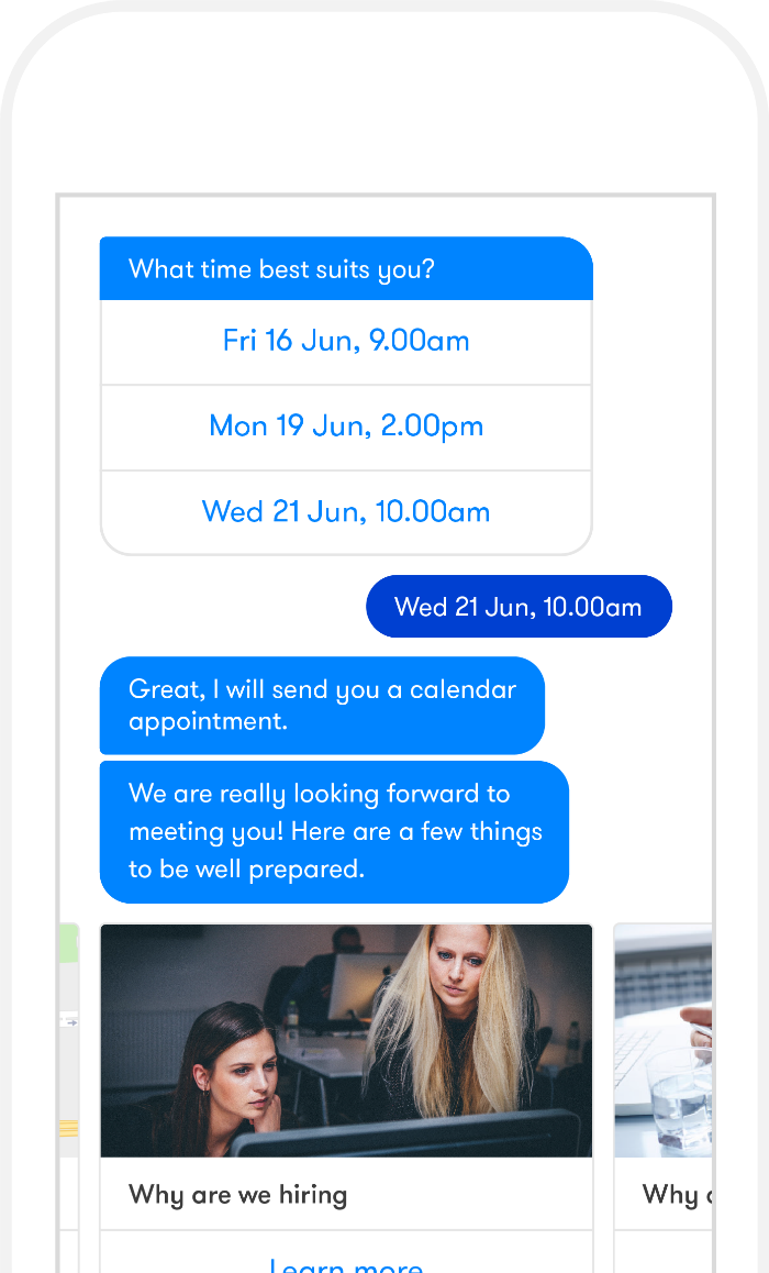 Engage with potential candidates, when they want, on platforms they know and trust. Our mobile-friendly chatbots are available on all devices, with no app install or candidate sign-up required. This ubiquity and low-friction approach delivers greater accessibility and convenience for candidates, combined with increased conversion for recruiters.